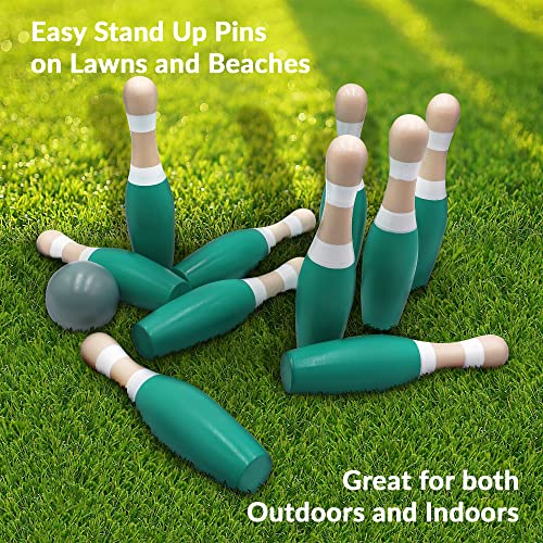 This wooden lawn bowling set features taller bowling pins than most other sets. It includes ten 9-inch bowling pins, two wooden bowling balls with a 3-inch diameter, and one carrying mesh bag for pickup and go or easy storage. The pins are weighted, so they are easy to stand up, but they are calibrated perfectly, so they can easily be knocked down with the bowling ball.